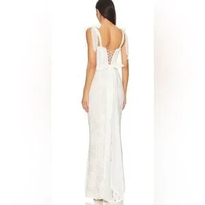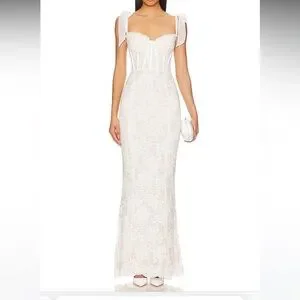 Absolutely stunning V. Chapman Romanza Gown in exquisite white Chantilly lace! This dreamy gown is perfect for rehearsal dinners, engagement photos, bridal showers, beach weddings, or any special occasion where you want to look effortlessly elegant.