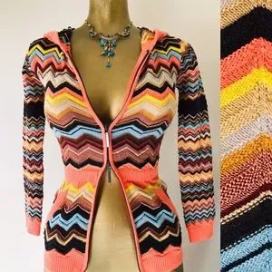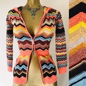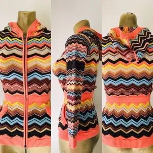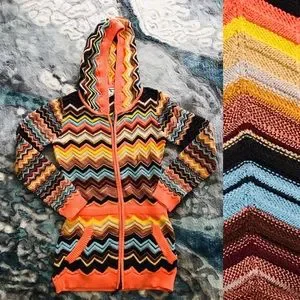 This is a colorful, new-without-tags, girls zip-front cardigan sweater with spaceknit pattern from the Missoni for Target 20th anniversary collection size small. Fabric is 52% rayon, 48% cotton and is machine-washable. Item have zip-front closure, two front hip pockets, attached hood. Approximate measurements are 28 inches at chest, 24 inches at waist, 28 inches at hips, 21 inches in sleeve length, 12 1/2 inches shoulder-to-shoulder. Accessories not included.