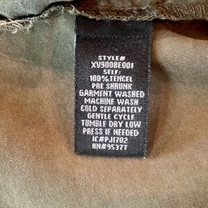 Excellent condition. Dark olive/army green, cinched with drawcord to accentuate waist line, gorgeous large decorative panels along chest, with draping fabric throughout. Pockets are purely decorative.
