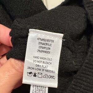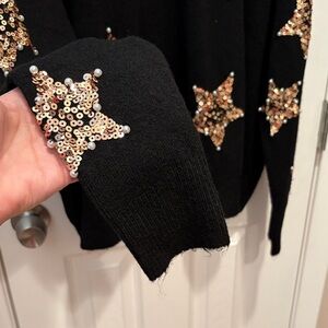 Chic black sweater with sparkling gold star embellishments. Crew neck design. Perfect for stylish comfort.