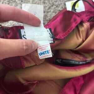 **has some white discoloration near the waist on the back near the hem on front. See last two photos. The flaws are not that noticeable in my opinion because of the sheen to the dress. Otherwise in brand new condition.