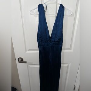Stunning blue plunge neck jumpsuit with pleated design. Perfect for special occasions.