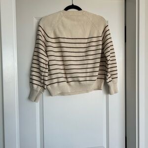 Cozy sweater with cream and brown stripes. Features a buttoned neckline.