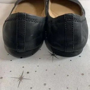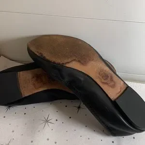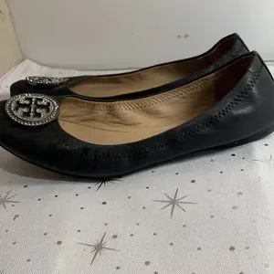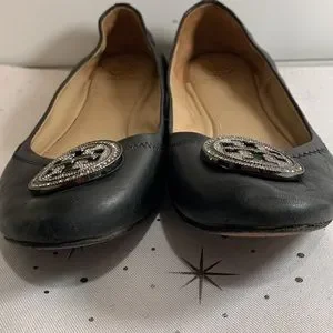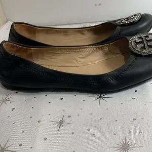 Elegant black flats with signature silver and crystal Tory Burch logo. Perfect for any occasion.