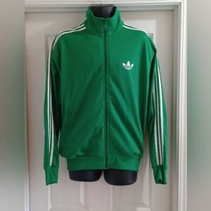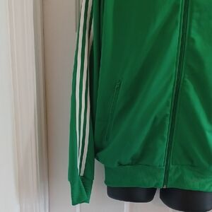 Classic vintage green track jacket by Adidas. Features iconic white stripes and logo. Ideal for casual wear or sports. In great, gently-used condition.