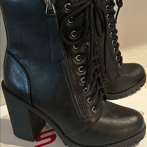 Step out in style with these chic black lace-up ankle boots with zipper closure. Perfect for any occasion, they offer both comfort and elegance. 3.5” heel