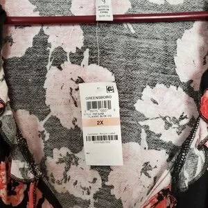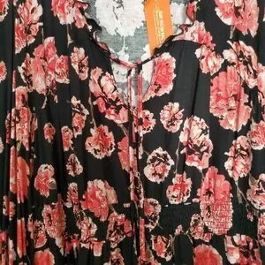 Beautiful floral patterned blouse with shades of peach & black. The pictures come across as having pink-ish colored flowers but they are peach. Ruffled V-neck down to the ties & around to the upper part of the back. Long sleeve elasticized cuffs with a little bit of a ruffle at the wrist. Generous Smocking at the waist, & a flowy shark bite hem. Super soft & it does have some stretch in it. Size 2X & if measurements are needed I'll be happy to take them for you!!