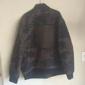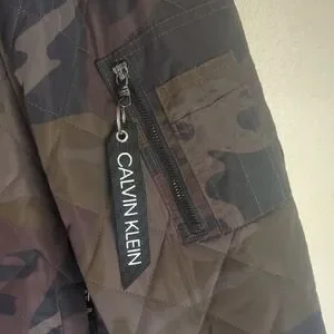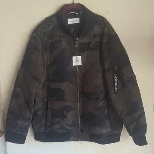 Elevate your style with this Calvin Klein bomber jacket. Features a bold camouflage pattern. Comfortable and trendy for casual wear.