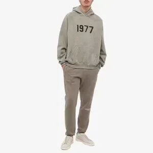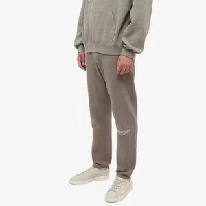 The Fear Of God Essentials sweatpants are made of a soft brushed cotton blend. They feature a relaxed fit with side seam pockets, an elastic waistband with drawstring, and elasticized cuffs. The logo is printed on the side, and there is a rubber label on the front.