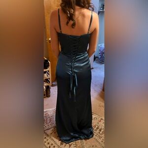 Step into elegance with this stunning teal evening gown. Perfect for any formal occasion, this dress features a sleek silhouette and a sophisticated slit. Make a statement with its rich color and timeless design.