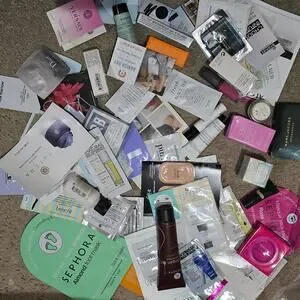 Sephora cosmetics bag full of samples, mini's, and some travel size products for face, Skin, and hair.