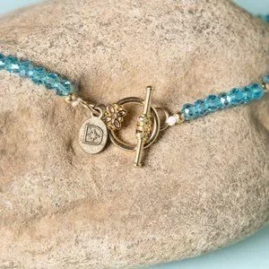 This fun, double layered necklace has unique beading and a teardrop turquoise pendant. There is mixture of multi colored beads ranging from crystals tp natural stone. It features gold hardware and a toggle closure.