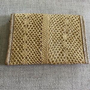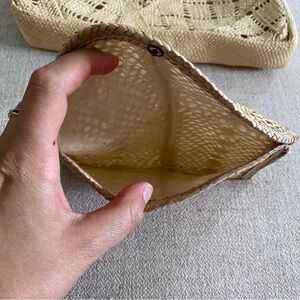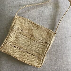 This stylish crochet shoulder bag in a beautiful tan color is perfect for any summer occasion. Its intricate design adds a touch of elegance to your outfit. Small area of broken straw on front of bag (see photo).
