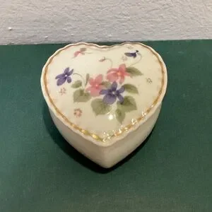 Vintage porcelain heart shaped trinket dish decorated with pink and purple flowers and gold detailing.