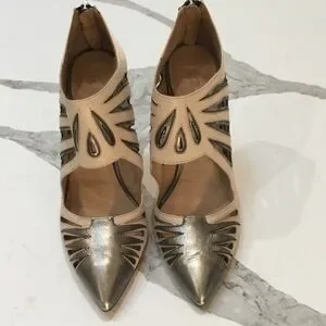 Step out in style with these elegant size 8 beige and metallic heels. Perfect for any occasion, these shoes offer a chic and sophisticated look. New without box.