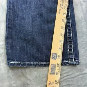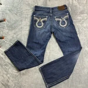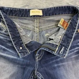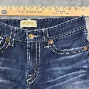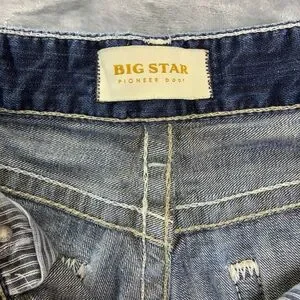 Big Star Pioneer Boot Men’s Jeans Size 33L in distressed dark blue with elaborate stitching.