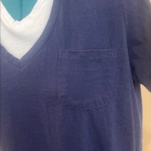 Navy short sleeve tee with white layered look. V-neck design. Comfortable and casual style.