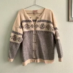 Cozy cardigan with intricate patterns from Woolrich. Features cream and gray colors. Perfect for layering. Condition is vintage however this has been “boiled” in the wash by accident so it has shrunk from a normal XL to a cropped chunky large/medium please review measurements for fit (will be listed as large). Minor flaws include a chipped broken top button and a patched up area on sleeve. Thanks for viewing!