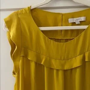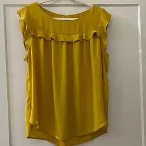 Chic mustard blouse with elegant ruffle detail. Ideal for versatile styling.