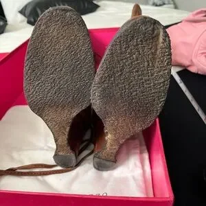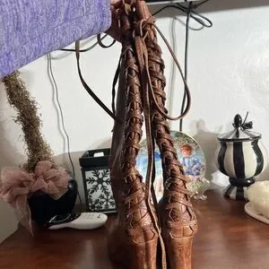 Elegant chestnut wedge boots with lace-up design. Perfect for any occasion. Preowned. Size 8.5. See images for heel height. Lenght of boots is 18”.