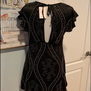 FREE PEOPLE Shine Like the Stars Beaded Mini NWT! Absolutely gorgeous dress w/stunning silver beading, keyhole tie closure in back and flutter sleeves. Sz S. SOLD OUT ONLINE! Measurements in pics!