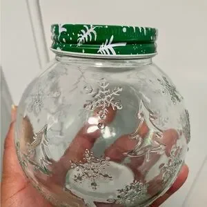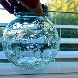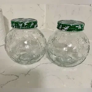 Set of two round glass jars with embossed Winter Trees 🌲 and snowflakes ❄️.