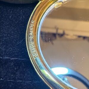 Estée Lauder gold compact mirror with a pink textured cover. 🐈⬛