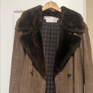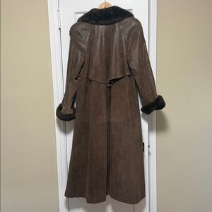 Brown italian Leather Trapeze Coat with Fur Trim.