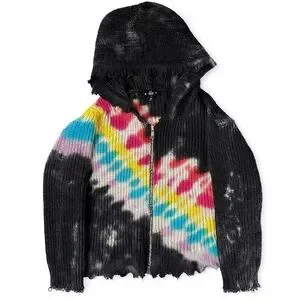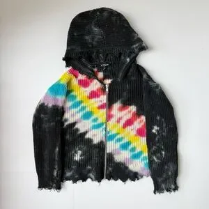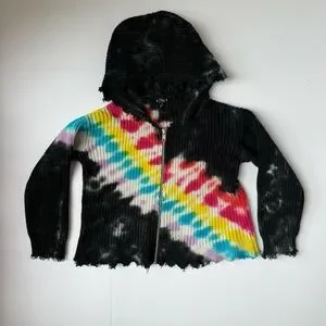 FBZ girls zip-up hoodie sweater in size 5. Features a black knit base with bold multicolor tie-dye accents and a distressed, cozy look. Soft, comfortable, and easy to layer for school, play, or casual outfits. Good condition with plenty of wear left. From a smoke-free home. Ships same or next day.