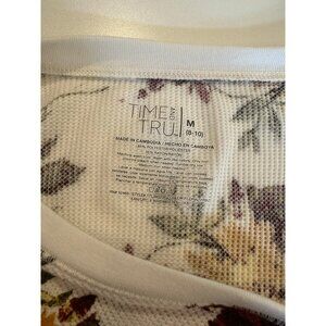 Cozy up in this soft floral waffle-knit henley, featuring rich fall-inspired blooms in gold, wine, and plum. The lightweight stretch knit makes it perfect for layering, lounging, or everyday errands, with a flattering button neckline that adds just the right touch of charm. Size Medium — a comfy, pretty, wear-anywhere favorite.