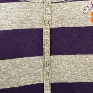 Antigua long sleeve Clemson University top with Henley styling in purple/gray stripe with Clemson Tiger Pas logo embroidered on left chest. Measurements - pit to pit 19 inches, length 25 inches. Measurements made lying flat and are approximate. Smoke free environment.