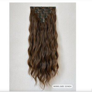 Enhance your look with these natural brown hair extensions. Perfect for adding volume and length. Easy to apply and style. Color: Copper Brown. Water wave Style 22 In long Clip in set Around 240 grms Enough for full hair. Natural Fiber, that imitates Human hair appearance. No shiny plastic look. High Quality!, realistic look and easily Blends with Human hair. * High heat Resistant, can be curled, Straightened with high temperatures a (400F) Open to offers Thank you! More Hair extensions listed in my poshmark page.