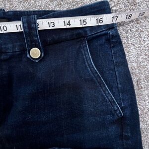 Talbots dark denim wide leg, high rise denim jeans. Belt loops in front and middle back loop have a brass button.