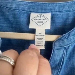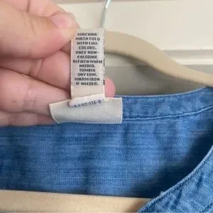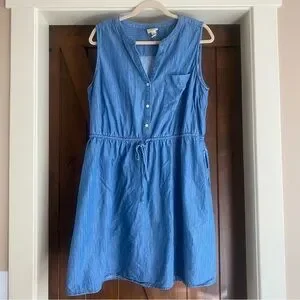 Sleeveless denim dress. Button front. Drawstring waist. Chest pocket detail.