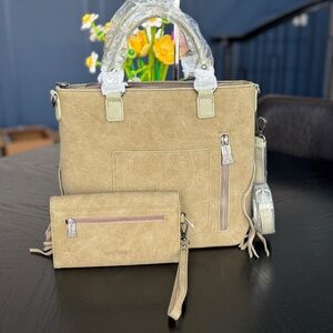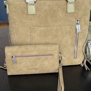 Trinity Ranch Aztec Tooled Fringe Concealed Carry Tote/Crossbody + Wallet Green