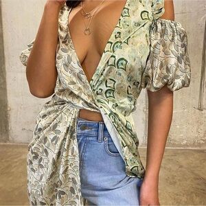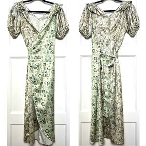 NEVER FULLY DRESSED Satin Puffed Sleeve Cold Shoulder Ruffled Wrap Midi Dress 2