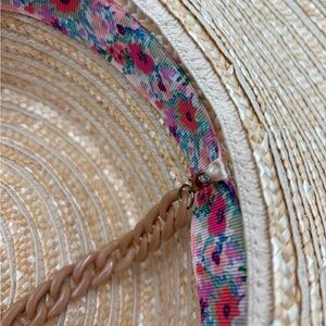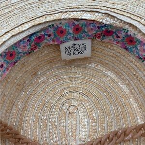 Brand new with tags, this Macy's Flower Show woven straw sun hat is the perfect warm-weather accessory. Features a chic boater-style crown, a wide structured brim for excellent sun coverage, and a stylish tan chain detail around the base. Inside is a cute floral band in signature Flower Show print.