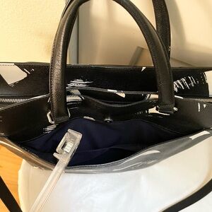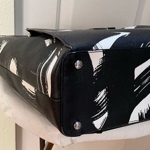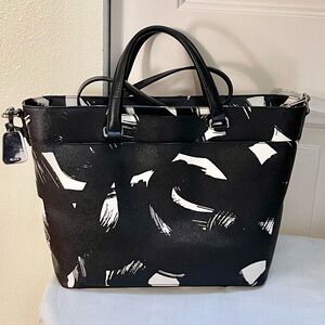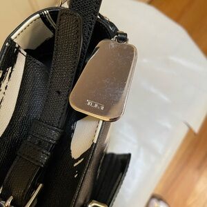 TUMI Sinclair large Camila tote with detachable long strap for shoulder or crossbody use in very good preloved condition. Silver tone hardware has some wear. The front pocket inside is a little dirty but hardly noticeable otherwise the bag is clean inside and out. No rips.