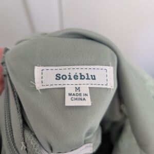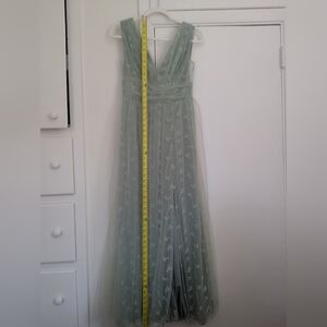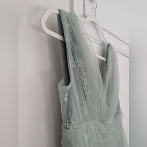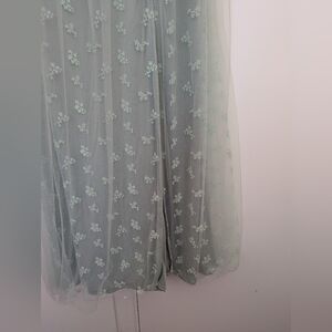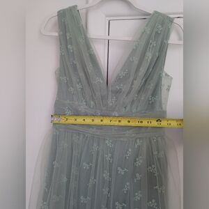 Charming mint green maxi dress by Soieblu. Features floral embroidery and a plunging V-neckline. Ideal for elegant events. Has been tailored with flutter sleeve removed as seen in second photo. Tailored to someone 5’3”.