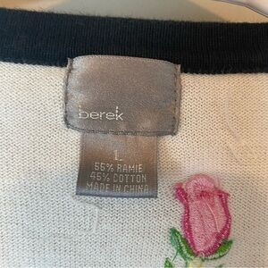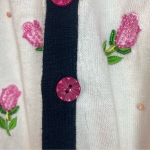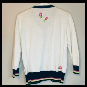 Elegant white cardigan with pink floral designs. Features green leaf accents and dark trim.