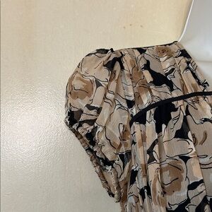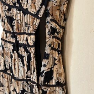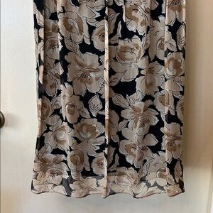 INC silk floral midi dress with a black and tan pattern. Sheer cap sleeves and fully lined in black. There is no zipper but instead the dress snaps on the side. Perfect for versatile styling. Like new condition