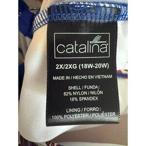 Catalina Red White Blue Paisley Print One-Piece Swimsuit in Size 2XL (18W - 20W) is a stylish and comfortable swimwear option for women. This one-piece features a crisscross back strap design, built-in bra, and adjustable straps for a personalized fit. Made from polyester and nylon with a colorful paisley pattern. Hand wash only to maintain its quality, and enjoy the theme of travel, beach, colorful, and summer in this delightful swimsuit. New with tags, still contains hygiene tag.
