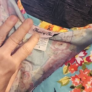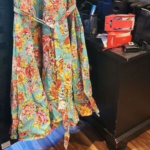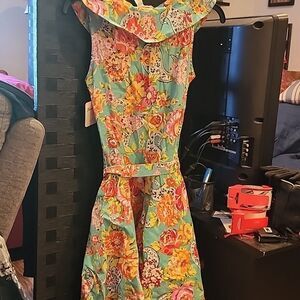 cotton dress aqua with floral and paisley print in pink, yellow and orange. has belt. NWT. pockets. side zip. waist 26. pit to pit 17. shoulder to shoulder 13. length 23 from waist.