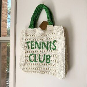 Toss and go with this so-cute woven raffia tote, in a two-tone design featuring a "tennis club" motif for a special touch.