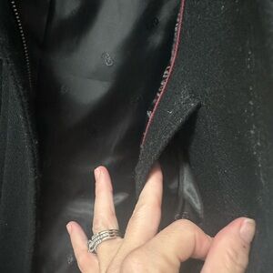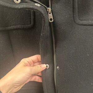 This Cole Haan pea coat in a deep black hue offers a timeless and versatile style. Crafted from a wool-blend fabric, it provides warmth and sophistication for cold weather. Its tailored silhouette and structured design make it suitable for both formal and casual occasions.