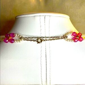 This charming necklace showcases elegant pearls and delightful pink floral accents, perfect for enhancing any ensemble.