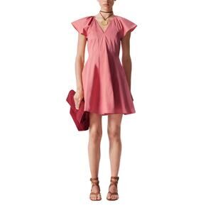 & Other Stories 'Flared' Pink Cotton Mini Dress Size 4: a crisp, lightweight, designed with a structured silhouette, a deep v-neck, short flared sleeves, and a fitted waist that shapes into a flared skirt, a concealed back zipper, measurements: 15.5 inch bust x 35 inch length.