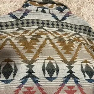 Stylish button-up shirt with a geometric aztec pattern. Features shades of brown, blue, and red. It is a mens sized medium. Last photo shows the websites info.