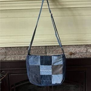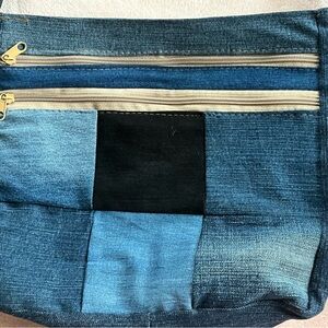 This is a handmade, upcycled, patchwork denim crossbody or shoulder bag with various blue and black panels, an adjustable strap, and zipper closures.