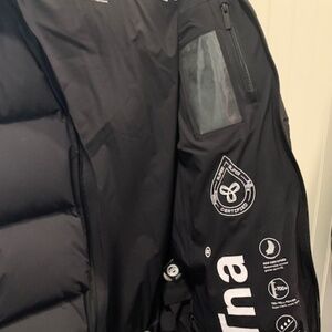 Stylish, sleek and warm matte black Aritzia puffer jacket. Perfect for cold and rainy/windy weather. Warmest down to -30 C. 100% responsibly sourced, 800+ fill-power premium down, super warm, super light, waterproof (repellent) and windproof with matte black finish, soft feel. Machine washable. Like new with detachable hood.